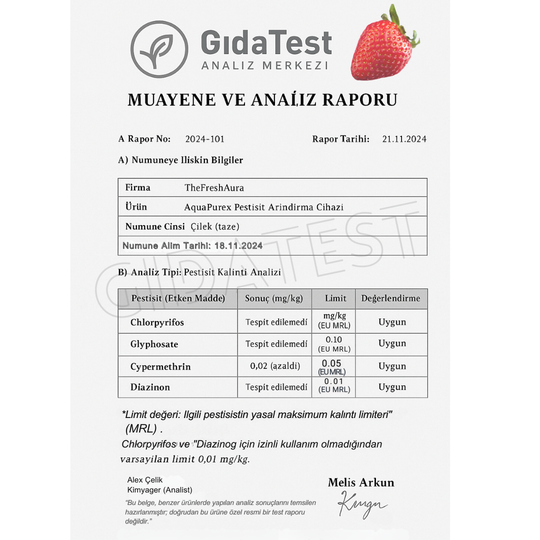 “Bir gıda mühendisi olarak yıllardır pestisit kalıntılarını analiz ediyorum. AquaPurex™ Detox’un bu alandaki etkisini kişisel gözlemlerimle değerlendirme fırsatım oldu. Kimyasal kullanılmadan böyle bir temizlik süreci sunulması, özellikle çocuklar ve hassas bireyler için gerçekten önemli bir avantaj.”