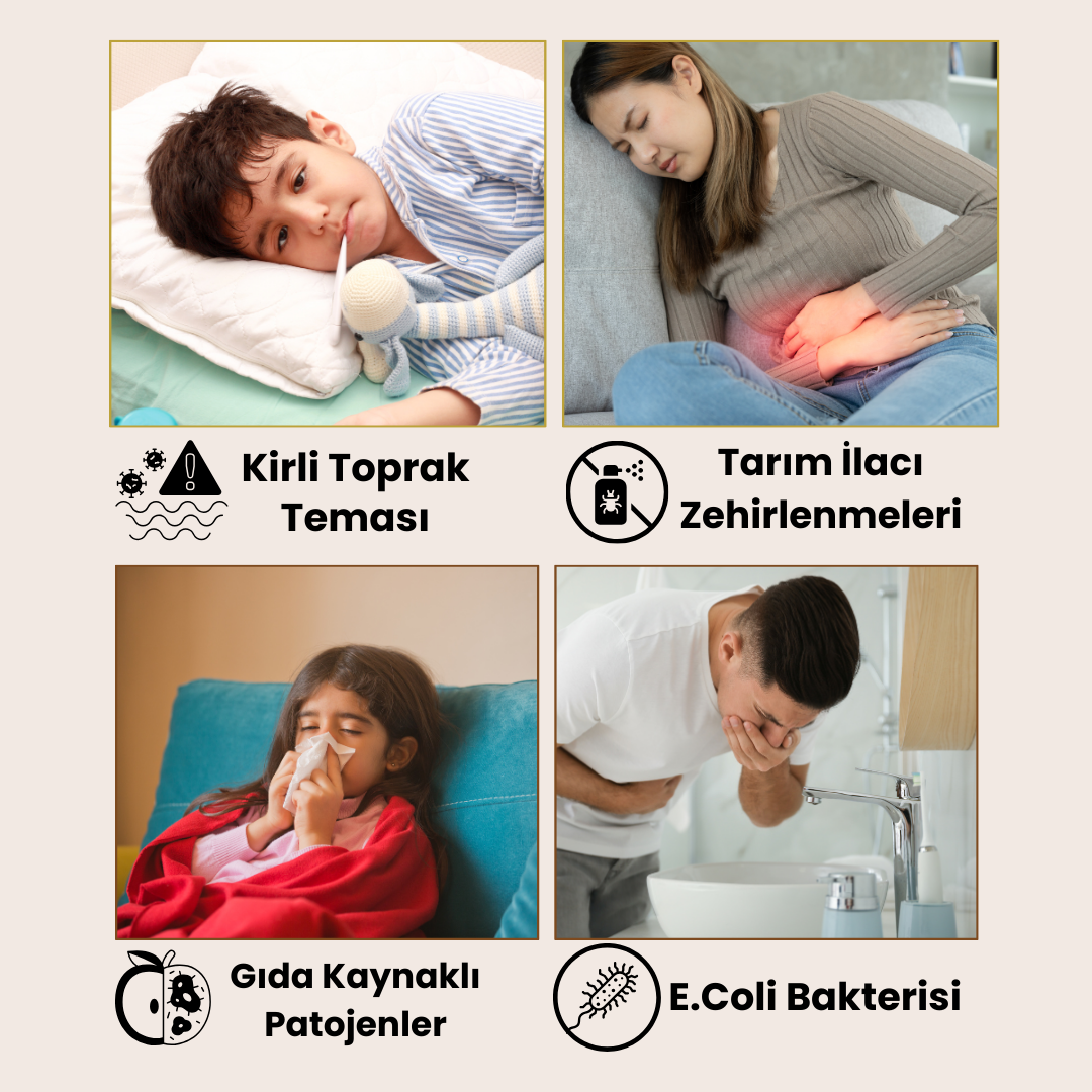 🌱 Kirli Toprak → Yıkanmamış sebzelerle zararlı mikroorganizmalar vücuda girer