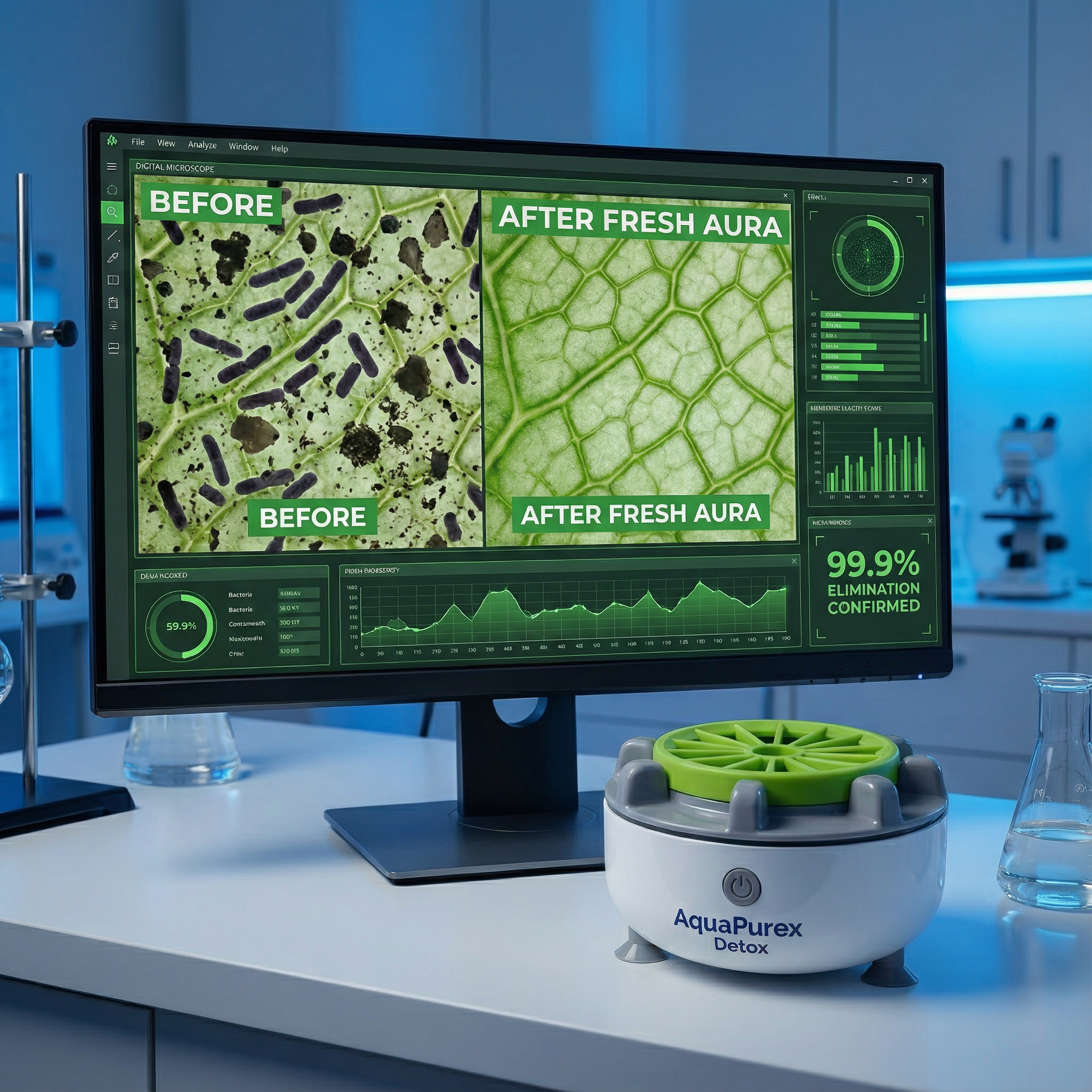 - The Fresh Aura™: Penetrates deep into pores. Removes 99.9% of contaminants. Zero aftertaste. Automatic.